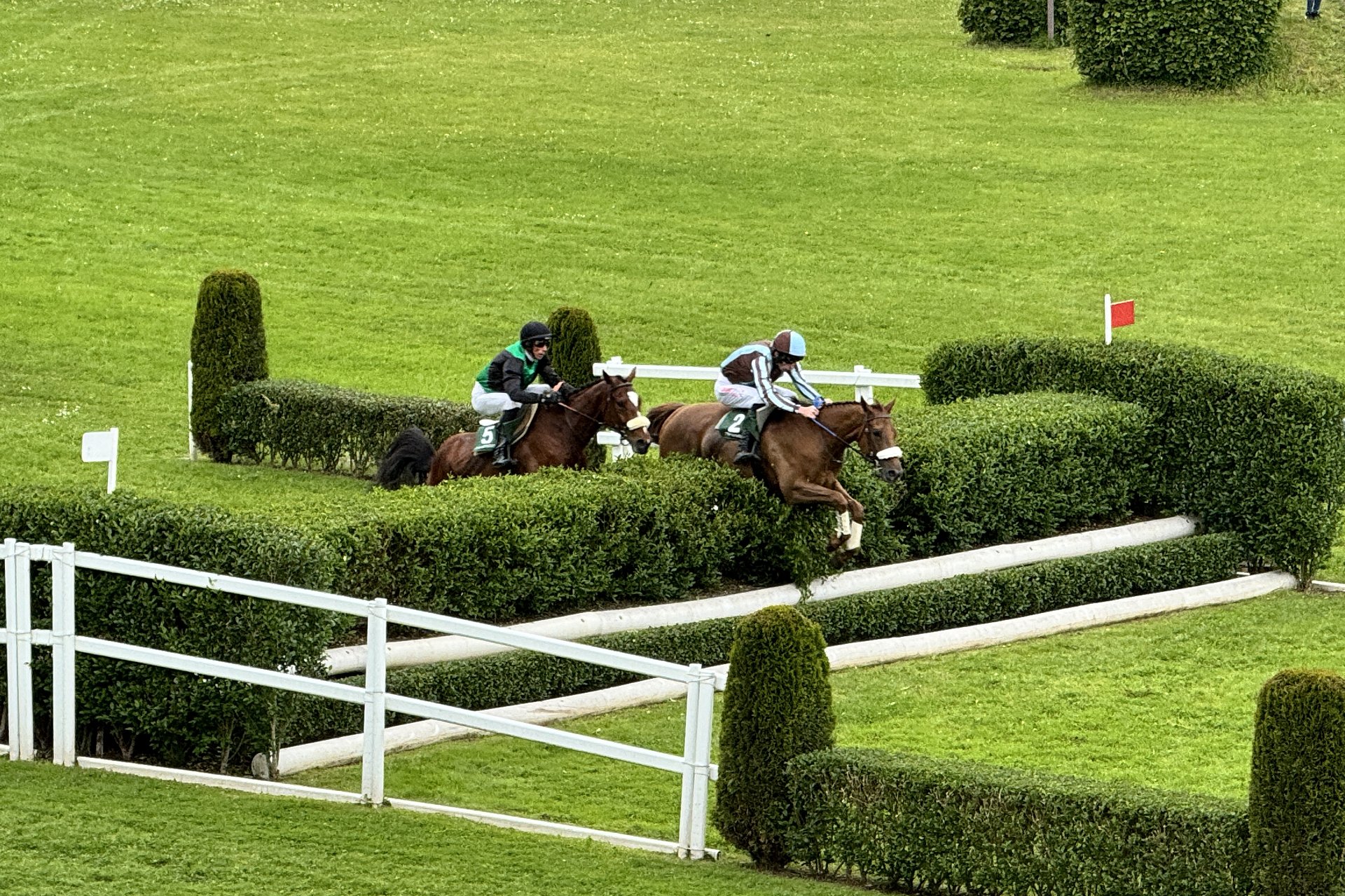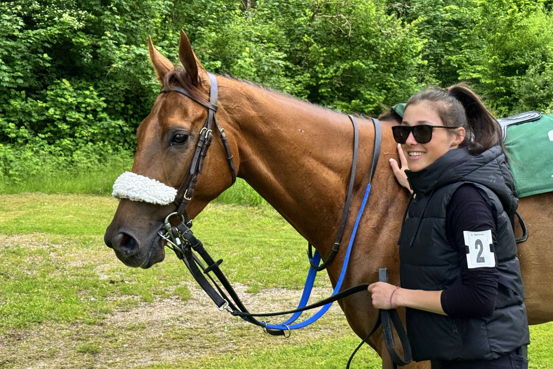 Im Hauptereignis war die Reihe an AMFI, ebenfalls mit James. Als Einzige im Feld noch ohne Hindernisstart in diesem Jahr hatten wir von ihr noch keine Wunder erwartet. Sie lief lange im Vordertreffen mit, hat sich aber unterwegs einmal heftig ein Vorderbein angeschlagen. Ihre flüssige Aktion liess sie schliesslich vermissen und vor dem Schlussbogen war AMFI definitiv schon geschlagen. Das war offensichtlich nicht das, was AMFI kann. Wenn man ihr Bein heute sieht (Bluterguss, geschwollen...), ist klar, dass sie damit keine Leistung mehr erbringen konnte. Wir hoffen, dass sie sich bald davon erholen wird.