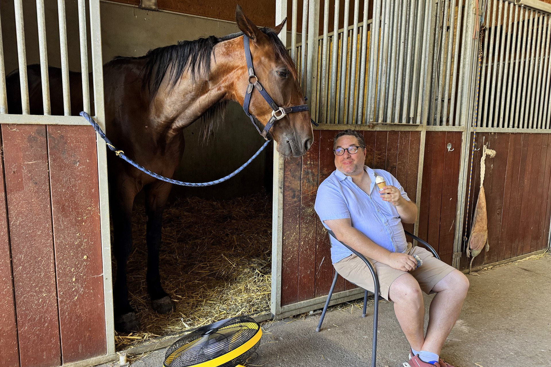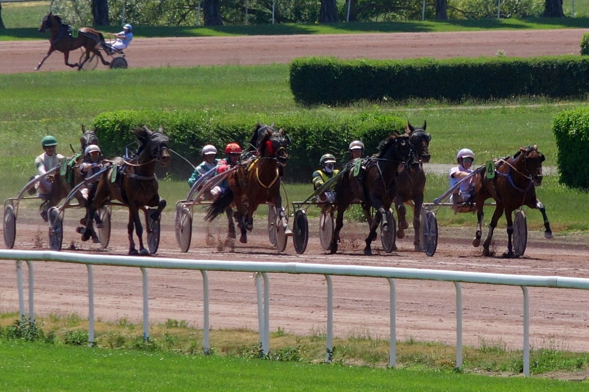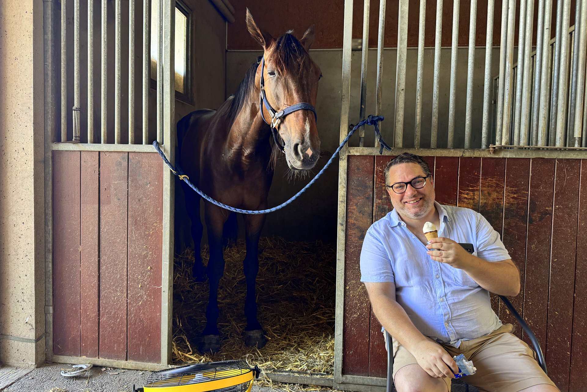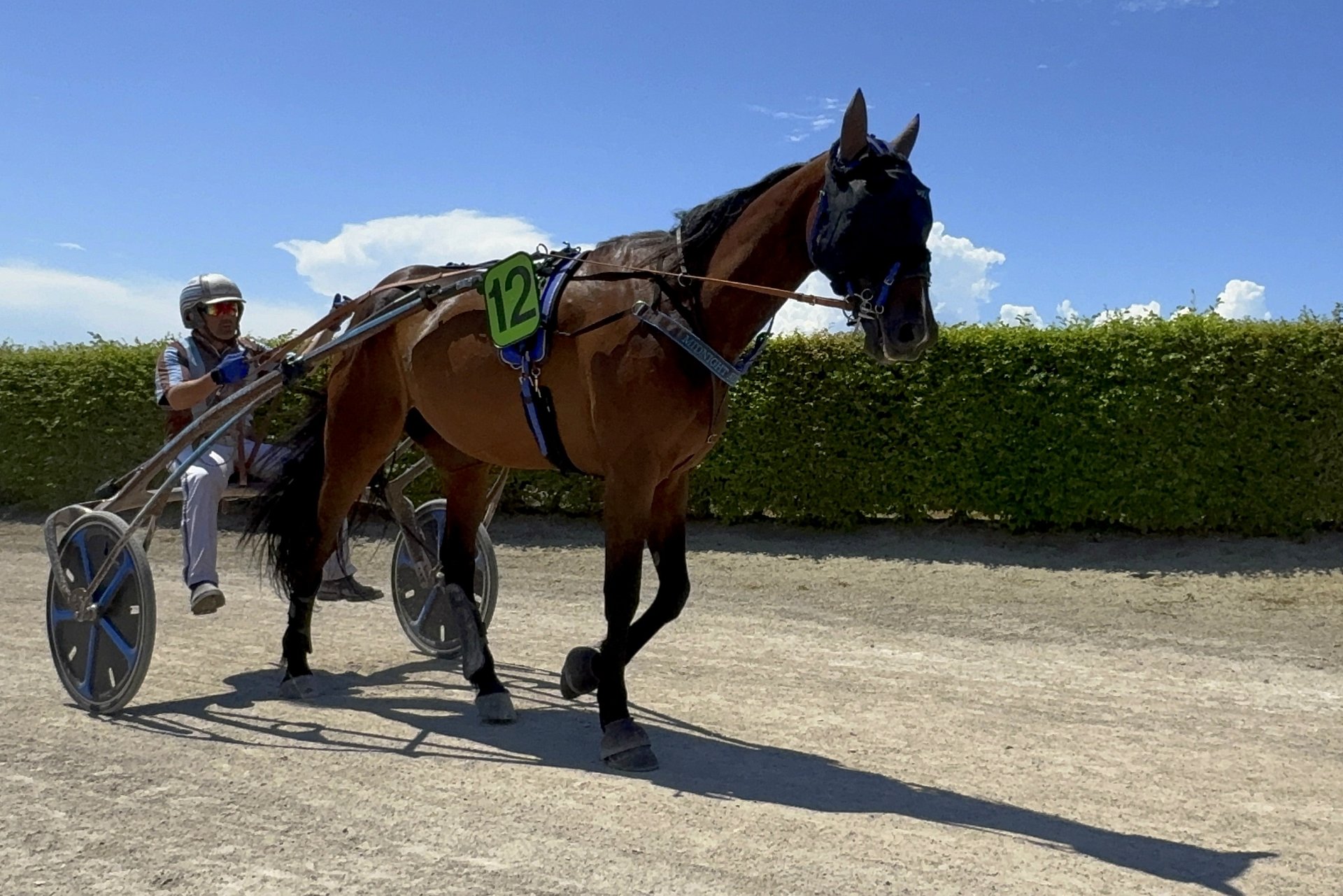 Am Schluss kam MIDNIGHT dran und setzte noch einen drauf! Anders als beim letzten Avenches-Auftritt, wo wir aus organisatorischen Gründen die Anreise nicht frühzeitig (sondern am Vormittag des Renntags; damals wurde ausnahmsweise am Abend gelaufen) machen konnten, war MIDNIGHT diesmal voll da. Nicht müde... Loris liess ihn im Einlauf angreifen und die beiden bekamen all ihre Gegner im Nu leicht in den Griff. Der Sieg sei leicht ausgefallen, sagte Loris beim Verlassen der Bahn und er prophezeite, dass MIDNIGHT mit dem Alter noch besser werden würde. Sein nächster Einsatz könnte wie für die anderen beiden am 8. August auf Gras sein.