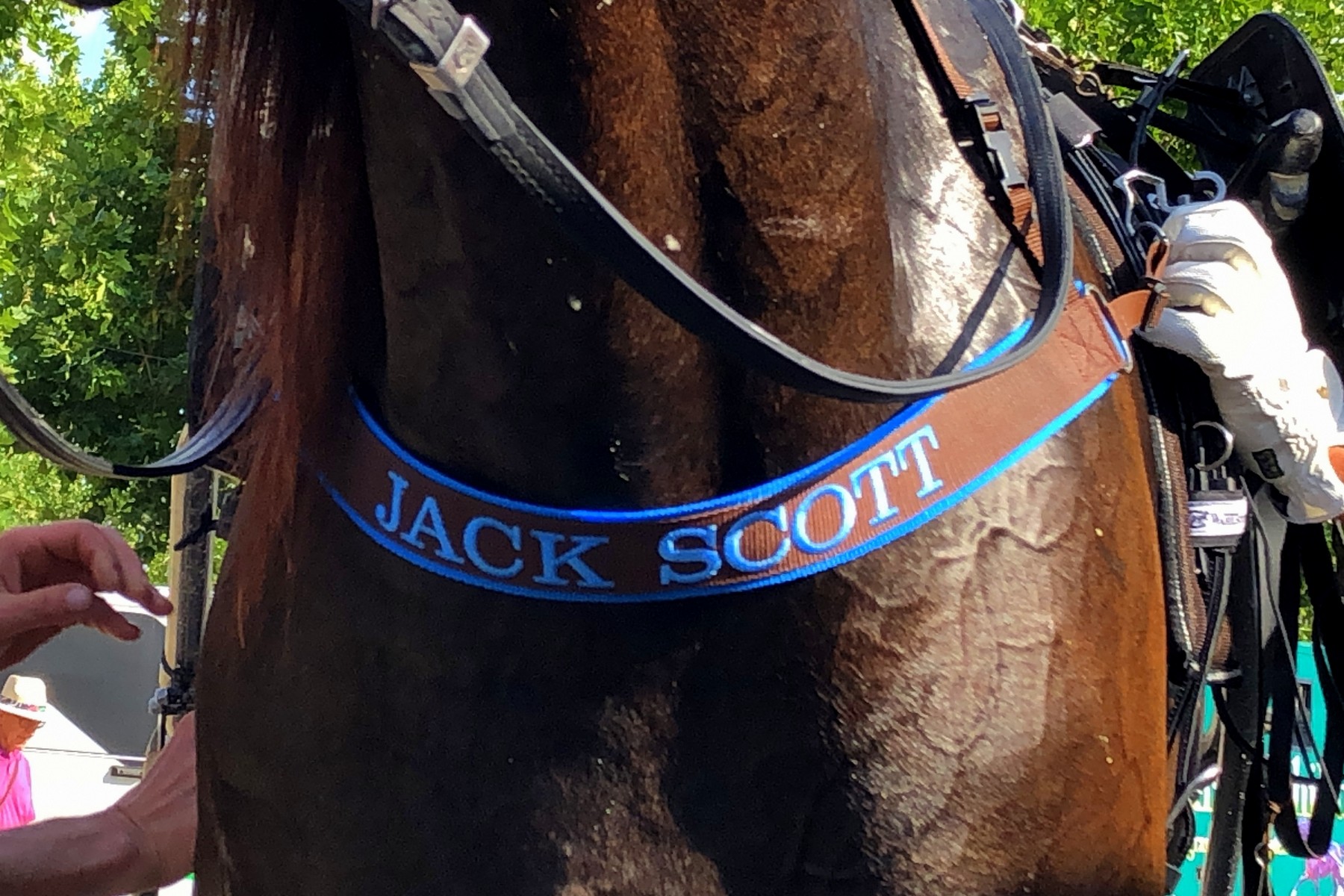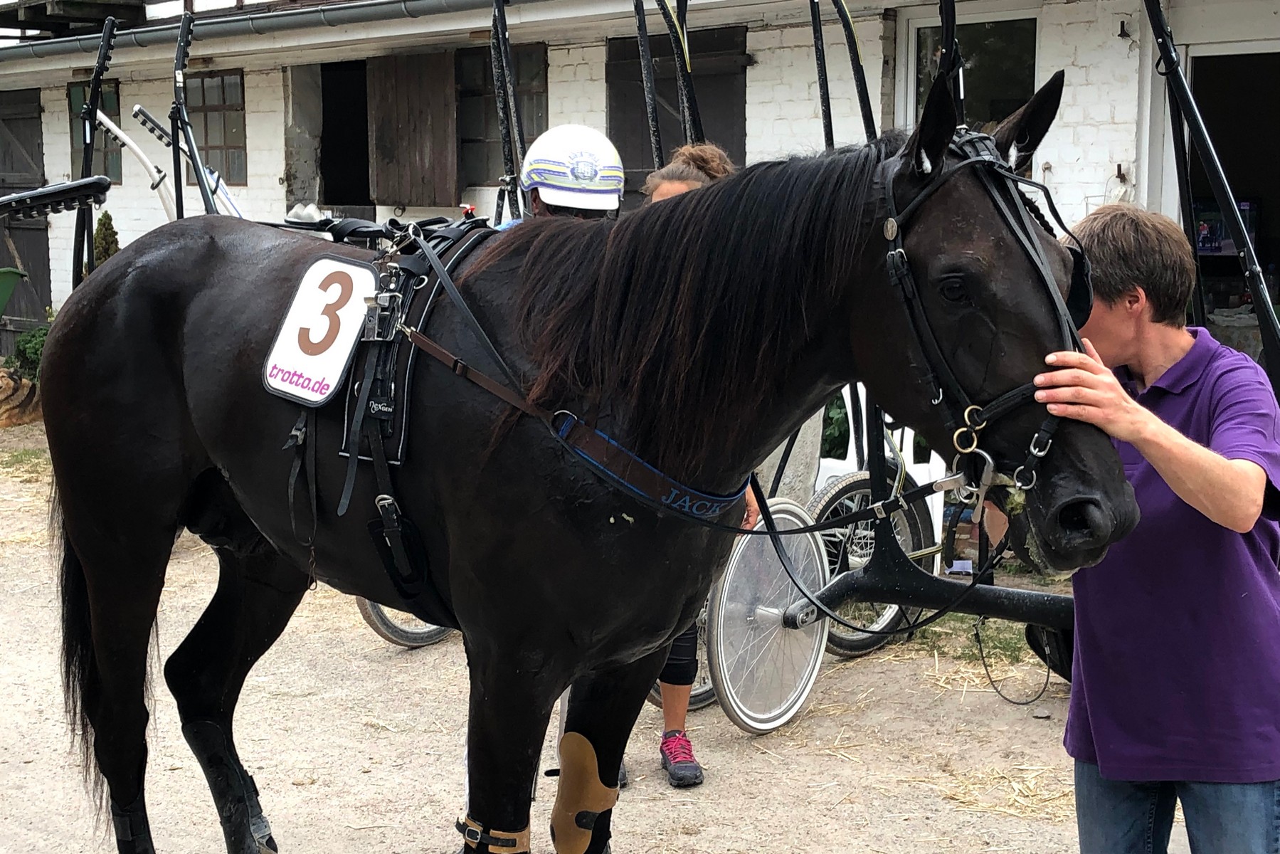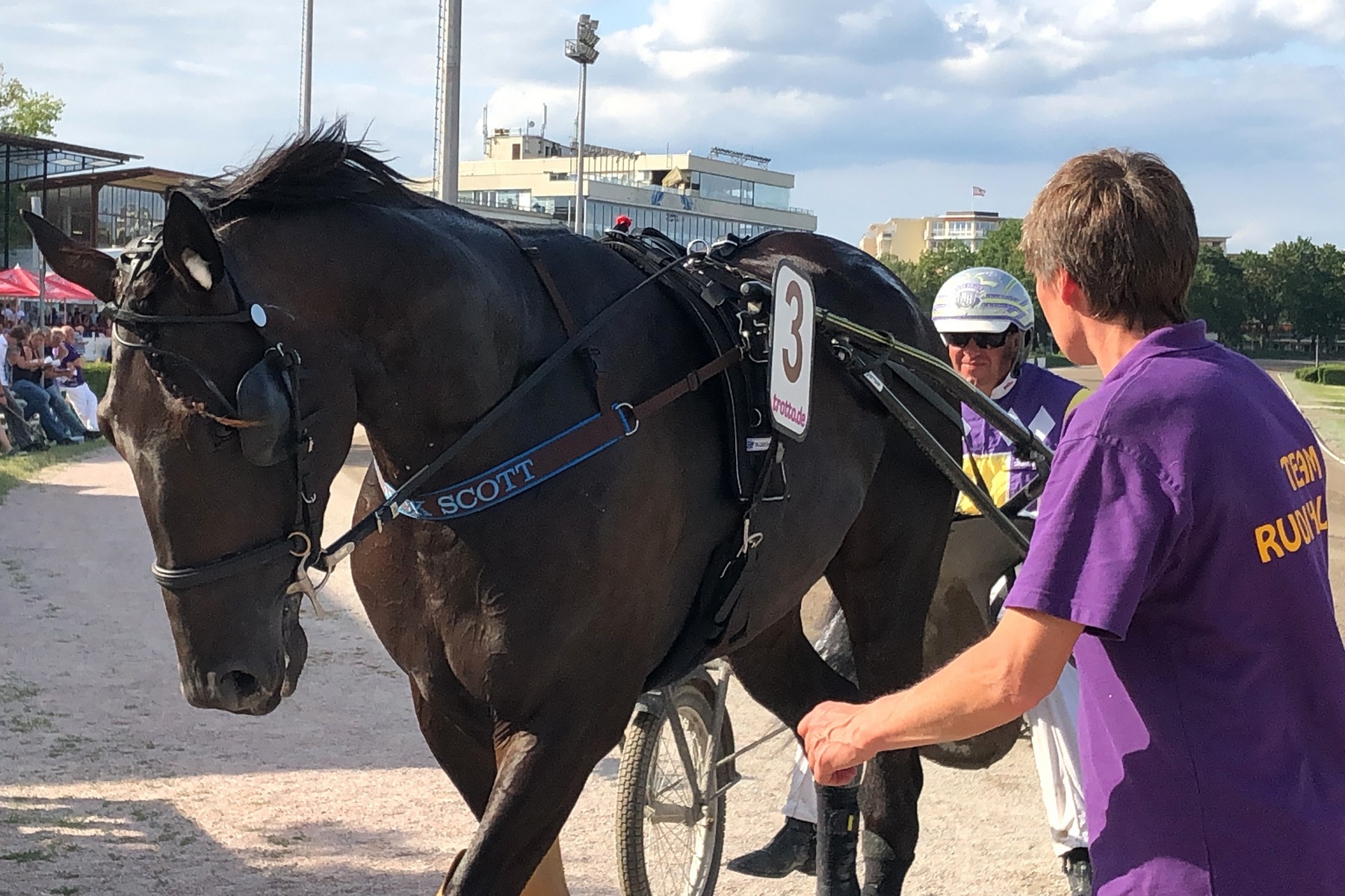 Am Abend, kurz nachdem Rudi mit Jacks Trainingsgefährten Rancoon um zwei Wimpernschläge den (sensationellen) Derby-Sieg verpasst hatte, war unser Jack Scott am Start. Die Anfangsphase ging wieder beinahe schief - zwar startete Jack gut, doch noch vor dem ersten Bogen fiel er urplötzlich in Galopp. Aus, vorbei - dachten wir. Doch Rudi hatte ihn schnell wieder im Trab und rückte vor der Tribüne gar mit an die Spitze auf. Ganz in Front kam Jack nicht, die Leaderin hatte etwas dagegen. So musste Jack fast das ganze Rennen in der "Todesspur" (aussen mit der Nase im Wind) absolvieren. Trotzdem bekam er die Animatorin im Einlauf rasch in den Griff. Doch der in seinem Rücken geschonte Gegner, den Jack die ganze Zeit mitgezogen hatte, machte auf den letzten 200 Metern noch mehr Reserven frei. Rang zwei, eine Länge hinter einem gewiss nicht schlechten Gegner und zwei Längen vor einer bis gestern ungeschlagenen Muscle Hill-Stute. Dies alles in 1:15,0 mit neuem persönlichem Rekord. Well done Jack. Rudi war denn auch sehr zufrieden. Nach dem Fehler habe Jack keinen falschen Tritt gemacht, er sei den letzten Kilometer in 1:13,8 gelaufen. Tiptop. Nun überlegen wir in Ruhe, wie es für Jack weiter geht. In drei Wochen hätte er wieder in Berlin ein schön dotiertes Auktionsrennen (für Dreijährige, die vor zwei Jahren in Berlin durch den Ring gegangen sind). On verra - oder eben schaun mer mal...