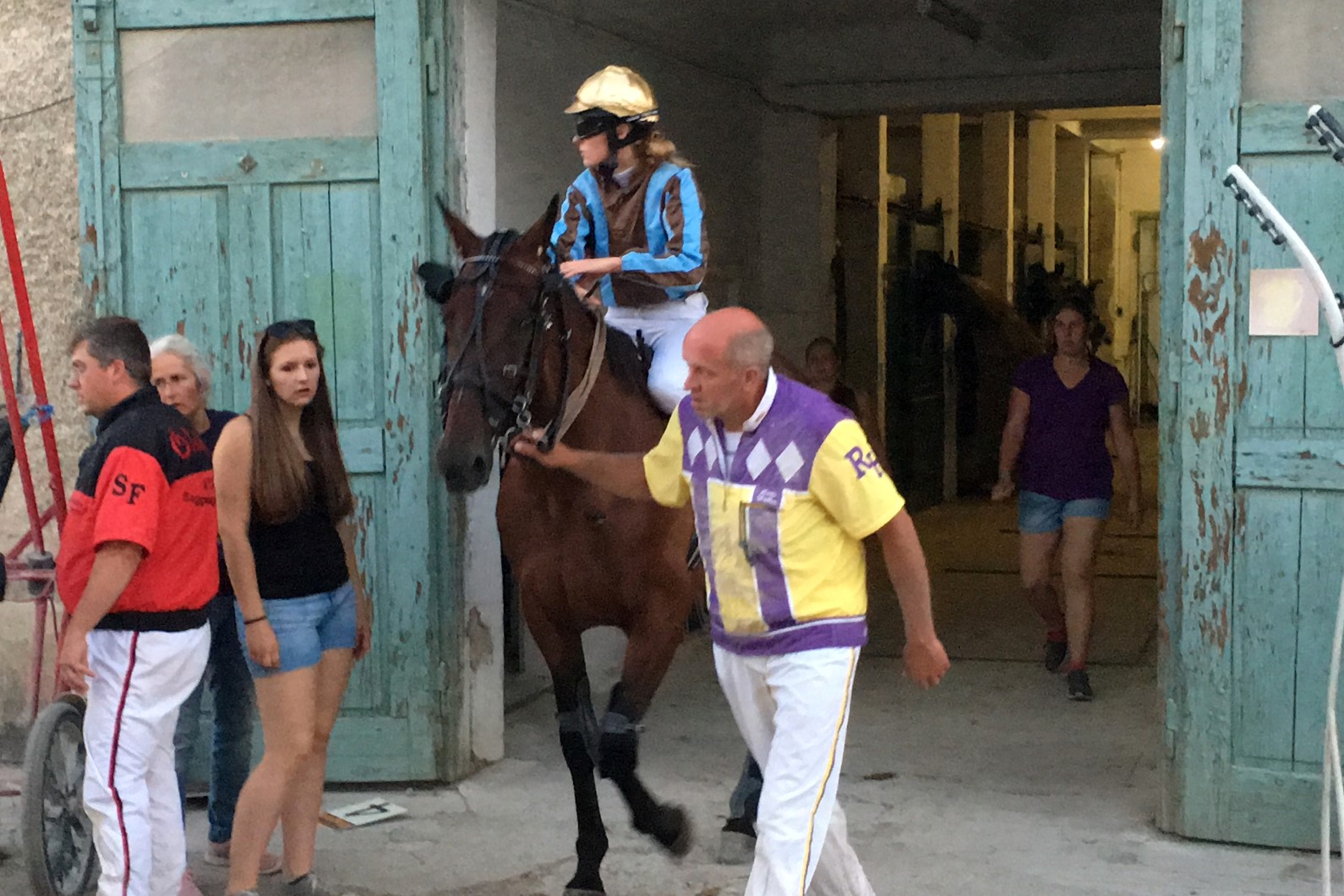 Rudi führt Top und Ronja aus dem Stall auf die Bahn.