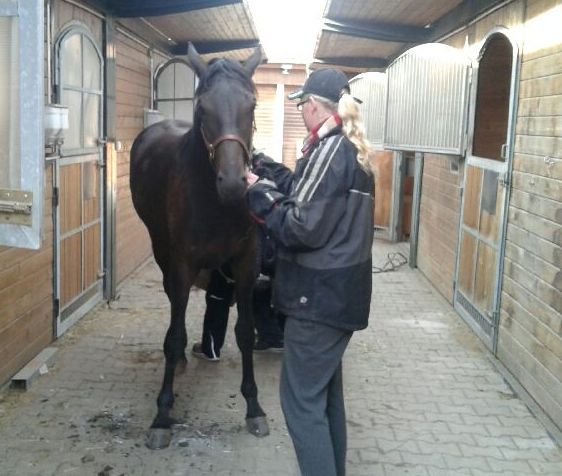 Jack macht die ganze Prozedur tiptop mit. Nur zu Beginn, wenn man ihn auf der Weide einzufangen versucht, findet er es unheimlich lustig und will zeigen, welche Kniffe er als freiheitsliebender junger Hengst drauf hat. Jedenfalls braucht es etwas Geduld, bis das Halfter an seinem Platz ist und Jack am Strick von der Weide geführt werden kann. Hat aber bisher noch immer geklappt... big smile.