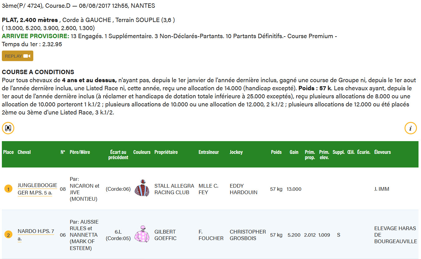 Eddy Hardouin, der Lebensgefährte von Trainerin Carina Fey, ritt ein von A bis Z perfektes Rennen. Früh im Rücken einer der Leader in zweiter Spur, rückte er gegen den letzten Knick auf der speziellen Bahn von Nantes mit an die Spitze auf und liess Jungleboogie in der Folge sehenswert antreten. Im Nu war die Entscheidung gefallen - mit nicht weniger als 6 Längen Vorsprung galoppierte Jungleboogie als überlegener Sieger ins Ziel. Das war in dieser Form gegen dies zum Teil doch starken Gegner nicht zu erwarten gewesen. Eine hervorragende Vorstellung, über die wir uns riesig freuen.