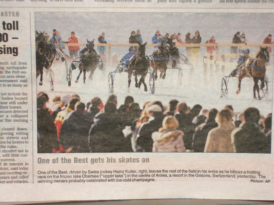 Nun, es ist natürlich vielmehr das exotische Bild von einem Pferderennen auf einem gefrorenen See, welches eine australische Zeitung veranlasst hat, die Rennen in Arosa zu thematisieren. Und sicher nicht der Sieg von ONE und Heinz (der heute - 5.2. - übrigens Geburtstag hat) am 24. Januar 2010.