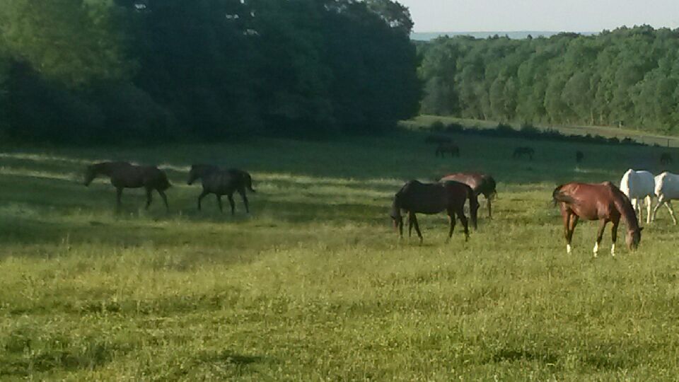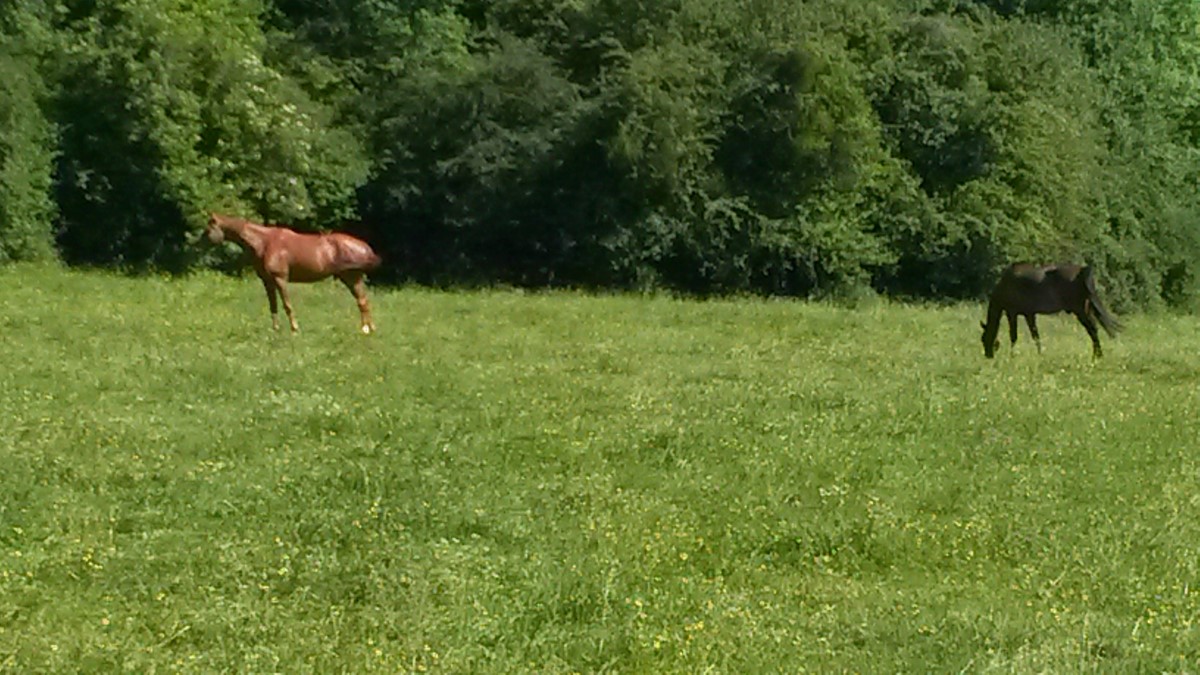 Für Vivo geht es nun darum, sich in der grossen Herde einzugewöhnen: 40 Pferde, darunter 15 Vollblüter (Vencecor, Hounded, Luga oder auch Bahia Bay sind sicher dem einen oder anderen noch ein Begriff), haben zwei grosse, gepflegte Weiden zur Verfügung, in deren Mitte sich ein Wald befindet. Sie werden täglich betreut, tierärztlich kontrolliert und je nach Jahreszeit gibt es auch Zusatzfutter. Natürlich wird regelmässig geimpft, entwurmt und Hufe/Zähne kontrolliert. Es gibt Unterstände, die vor Regen und Wind schützen. Im Sommer sind die Pferde tagsüber am liebsten im Wald, wo es kühler ist.