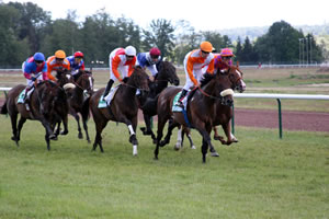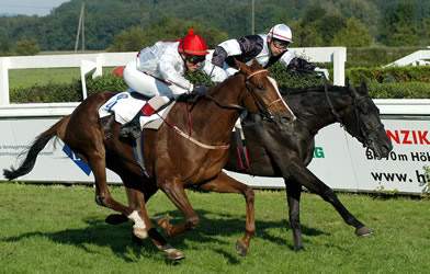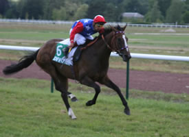 Weiss-Zweijährige Queen of Saba gewinnt in Mailand in Super-Stil (So 16.7.) Das sah sehr, sehr vielversprechend aus, was die von Miro Weiss in Urdorf für Hans-Georg Stihl trainierte zweijährige namens Queen of Saba am letzten Mittwoch (13.7.) in Mailand beim ersten Start ihres Lebens gezeigt hat. Die obschon ja erst zweijährig bereits sehr helle Schimmel-Stute kam in einem mit 22'000 Euro dotierten Maiden-Rennen über 1500 Meter an drittletzter Stelle in den Einlauf. Was dann folgte war eine Demonstration erster Güte: Mario Esposito machte mit der 5:1-Mitfavoritin Länge um Länge gut (zu Beginn der Geraden waren es gut und gerne 10-12 Längen bis zur Spitze). Die beiden schienen zu fliegen - dies obschon die Gegner nicht langsamer wurden. Sie zogen an allen vorbei und gewannen - nur mit Händen geritten! - mit dreieinhalb Längen. Dies gegen 14 Gegner (3 Nichtstarter) und obwohl sie Startverlust hatte und erst im Bogen zum Feld aufschloss... Weiterer Kommentar überflüssig. Queen of Saba (nicht zu verwechseln mit Alexander Pereiras "Königin von Saba", die vor drei Jahren im Stutenderby in Dielsdorf hinter Soul of Magic Rang zwei belegt hatte) ist gezogen wie eine Göttin: Ihr Vater ist der siebenfache Gruppe-I-Sieger Daylami, der nach seinem Breeders' Cup-Turf-Sieg im 1999 von Scheich Mohammed (der via sein Godolphin-Imperium der Besitzer ist) in die Zucht geschickt wurde. Und die Mutter Flourishing Way hat den grossen Vererber Sadler's Wells als Vater und stammt aus der Shernazar-Stute Darayna. Grossmutter ist die Spitzensprinterin Darafina. Das ist die Familie von Douyon (Sieger englische 2000 Guineas; 3. im Englischen Derby)... Fritz von Ballmoos feiert Listed-Zuchterfolg in England! (Sa 16.7. update So 17.7.) (Hinweis von Herbert Wohlgensinger) Grosser Erfolg für die Zucht von Fritz von Ballmoos: Der ehemalige RVZ-Präsident hat am Samstag mit dem von ihm gezogenen dreijährigen namens Beckermet (von Second Empire aus der Razida) in Newbury ein mit 16'240 Pfund dotiertes Listed-Rennen über 1200 Meter gewonnen. Der von Roger Fish trainierte Dreijährige hatte Martin Dwyer im Sattel und einiges deutete 200 Meter vor dem Ziel darauf hin, dass er in Schwierigkeiten war. Doch irgendwie - wie Mitbesitzer Laurence Nash sagte - schaffte er es doch noch, die Spitze zu halten. Die Mutter des Siegers, Razida, eine Last Tycoon-Tochter, steht bei Fritz von Ballmoos in Berg am Irchel. Jockey Martin Dwyer hatte zuvor im Super Sprint für Zweijährige mit der bis dahin ohne Geldgewinn gelaufenen 100:1-Aussenseiterin Lady Livius 24 Gegner (!) förmlich weggeblasen... Da ein 16:1-Aussenseiter auf Rang zwei und ein weiterer 100:1-Aussenseiter auf Rang drei einkam wurde die Dreierwette auf dem Platz von absolut niemandem getroffen... Divonne-Start mit CH-Sieg: Saman Khan gewinnt, Rotator auch - Okuczan 4. (Fr 15.7.) Das Meeting in Divonne-les-Bains beginnt hervorragend aus Schweizer Sicht! Walter Bieris Steepler Saman Khan gewann bei seinem ersten Start unter Romain Giller ein mit 9000 Euro dotiertes Hürdenrennen über 3600 Meter mit 3 Längen. Dies nachdem er und sein härtester Konkurrent noch Kopf-Kopf über den letzten Sprung gekommen waren. Rang drei hinter dem Wenisch-Crack holte sich Hubert Desponts Lancelot des Dimes. Im selben Rennen stürzte Cat City (Besitzer Heinz Furrer, Trainerin Helene Langmeier, Reiter Christophe Cheminaud). Der Sieg wurde mit 4320 Euro (also rund 6700 Franken) belohnt. Es war dies der erste Sieg über Hindernisse für Romain Giller, herzliche Gratulation! Der seit einigen Monaten in Paris stationierte Schweizer Trainer Urs Suter reiste mit dem ehemaligen Weiss-Schützling Rotator extra nach Divonne - ein Trip der sich gelohnt hat. Denn der sechsjährige Russe gewann mit Jean-Michel Breux im Sattel ein mit 7000 Euro dotiertes Verkaufsrennen über 2000 Meter. Rotator, der als Zweijähriger einer der dominierenden Youngsters in der Schweiz war läuft in den Farben von Jörg Büchi und holte sich 3500 Euro (rund 5400 Franken) - zum Preis von 6000 Euro war er in diesem Réclamer... Am selben Tag holte sich Stall Wisas Okuczan (Georg Bocskai/Carmen Bocskai) über 1200 Meter das 4. Geld. Etwas über 2 Längen hinter dem Sieger, aber Kopf-Kopf-Hals vor den nächsten Pferden... Dafür gab es 900 Euro (rund 1400 Franken) Hafergeld.