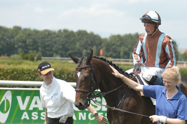 GP Divonne-Sieg für Georg Bocskai, Mount Etna 3./Top Way 4.(So 31.Juli ) Deutsch-Schweizer-Vierfach-Triumph am Sonntag im GP Divonne (2400m, 19'000 EUR). Der Iffezheimer Trainer Werner Hefter sattelte gleich die beiden erstplazierten im Achterfeld. Die vierjährige Stute Sinaada (u.a. 6. im GP Lyon, nicht weit hinter Song Writer, der dort 4. wurde.) holte sich mit Georg Bocskai im Sattel den Sieg, eineinhalb Längen vor der Trainingsgefährtin Penny McLean. Dritter wurde eine weitere Dreiviertellänge dahinter Mount Etna (Besitzer Hans-Georg Stihl, Trainer Miro Weiss, Reiter Sébastien Hamel) drei Längen vor Adolf Renks "Oldie" Top Way (Trainerin und Reiterin Brigitte Renk), der auf dem festen Geläuf nicht in seinem Element war. Mount Etna verdiente 2700 EUR, Top Way deren 1800. Fotos von George rip (Mail an George Rip für Bestellungen; hier klicken)