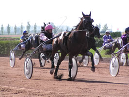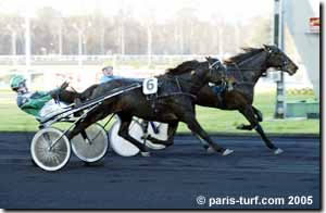 Vincennes-Auftritte: Kelly James und Onic Dream ohne Fortune (Di 29.11.05) An der Dienstag-Soirée in Vincennes kam es zu zwei mit Spannung erwarteten Auftritten von Schweizer Trabern: Die Kratzer-Ausnahmestute Kelly James bestritt mit ihrem Trainer Renaud Pujol das Quinté gegen 17 starke Gegner (42'000 EUR, 2100m, Autostart. Wie befürchtet war der Startplatz in der zweiten Reihe aussen ein (zu) grosser Nachteil. Zumal das Pferd unmittelbar vor ihr beim Start noch galoppierte. Danach musste Renaud Pujol weite Wege gehen, absolvierte jeden der 3 Bögen mindestens in 3. Spur. So konnte Kelly James von etwa 5./6. Position aus im Schlussbogen nicht mehr beschleunigen, hielt sich aber tapfer bis ins Ziel, welches sie im Mittelfeld erreichte. Sie stand am Toto 23:1. Der Sieger reduzierte 1:14,6 - eine Zeit von 1:15, 4 hätte noch für Rang 5 gereicht. Doch auch der Equidia-Kommentator anerkannte das "sehr schlechte Rennen, welches Kelly James hatte" und meinte, sie sei in einem nächsten Quinté (über längere Distanz) zumindest für ein Platzgeld vorzumerken... Stimmt, machen wir! Marc-André Bovay hatte seinen Onic Dream Crack-Driver Jean-Michel Bazire anvertraut (28'000 EUR, 2850 m, 15 Starter). Die beiden gingen mit einer Quote von 9:1 ins Rennen, konnten sich jedoch nicht plazieren.