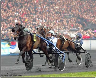 en faisant la monte en France en 2006). Totes Rennen: Mega-Showdown im 2. Amérique-Vorbereitungsrennen (Sa 10.12.05) Im zweiten von insgesamt 4 Vorbereitungs- resp. Qualifikationsrennen für den Prix d'Amérique, das prestigeträchtigste Trabrennen der Welt (nächste Austragung am 29. Januar 2006), erlebten die Zuschauer einen unglaublichen Kampf der Giganten. Die Pferde aus dem ersten Band starteten nicht ganz so schnell, so dass die Zulagepferde rasch aufschliessen konnten. Der Dominator der letztjährigen Saison und amtierende Amérique-Titelhalter Jag de Bellouet startete gut, machte dann aber ausgangs des ersten Bogens einen Fehler, der ihn gut und gerne 10-15 Meter kostete. Christophe Gallier entschied danach, auf die Karte Offensive zu setzen. Den "Berg" hinauf griff er an, übernahm resolut die Spitze und schien sich im letzten Bogen zu verabschieden. Doch "Jag", der noch immer nicht ganz in Top-Form ist (und sich im Rennen eine Schramme an einem Hinterbein geholt hatte) , zog nicht ganz durch, so dass sein Fahrer und Trainer seine Bemühungen in der Gerade einstellte und ihn austrudeln liess (Rang 5 am Ende). Der Kampf und den Sieg war dafür enorm packend: Super Light (Jörgen Westholm), der lange eingeschlossen war, fand die Lücke, schien darauf zu fliegen. Einen Moment lang glaubte Jörgen Westholm, sicher zu gewinnen. Doch er hatte nicht mit der Rückkehr der Dubois-Stute Mara Bourbon gerechnet. Die erst fünfjährige And Arifant-Tochter mit einer Gewinnsumme von fast 1.7 Millionen Franken (!) kam herangerauscht - Kopf an Kopf, Nase an Nase passierten die beiden Kontrahenten das Ziel. Keiner wusste, wer nun gewonnen hatte. Nach sehr langer Zielfoto-Auswertung wurden schliesslich beide zu Siegern in totem Rennen ausgesprochen. Wahnsinn - wir dürfen uns auf den Prix d'Amérique am letzten Januar-Sonntag freuen. Und hoffen natürlich, dass Arosa seine beiden Renntage plangemäss durchführen kann. Denn der "Ersatz-Renntag" wäre genau an jenem Amérique-Sonntag...