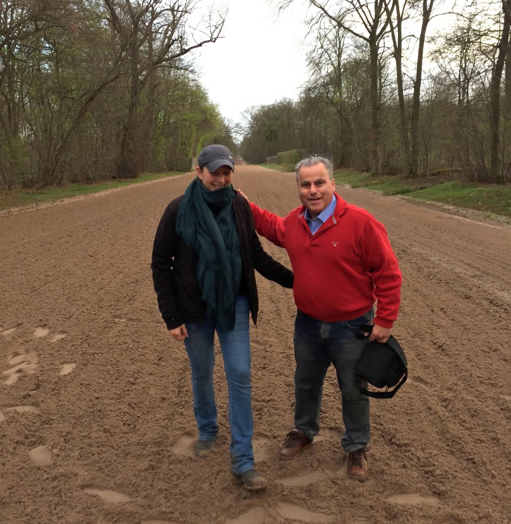 Christian mit Trainerin Carina auf der Sandbahn - hier sieht man erst, wie breit die Bahn ist...