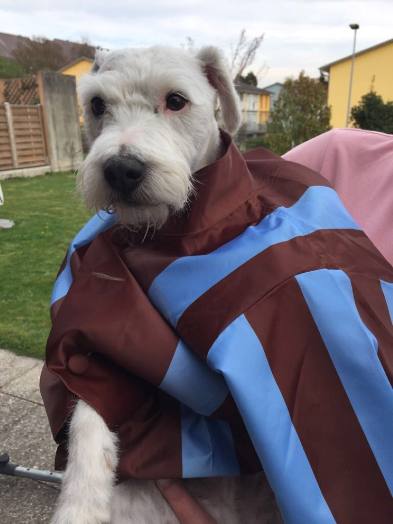 Christians Hund möchte soooo gerne Jockey werden. Die Farben stehen ihm schon mal gut!