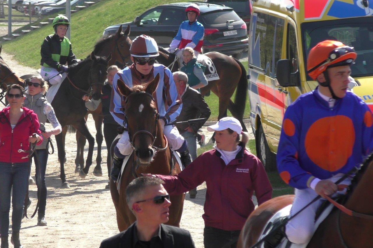 Kurz darauf war die Reihe an Bobby. Er hatte sich bei der Abfahrt schon bitten lassen. Denn er wollte ganz einfach nicht in den Transporter einsteigen. Ruhig blieb er stehen, ging nicht einmal in die Nähe der Laderampe. 45 Minuten Verspätung wegen Bobby, der dann doch noch mit wollte... Unterwegs war er cool, wie auch auf dem Rennplatz. Na gut, er zeigte schon auch noch, dass er ein junger Hengst ist. Aber er war insgesamt sehr brav. Nur wusste er offensichtlich überhaupt nicht, weshalb er diesen Ausflug nach Avenches gemacht hatte. Zu allem Übel musste er eine gefühlte Ewigkeit in der Startboxe warten (wo er gaaanz brav blieb und fast einschlief). Als es endlich los ging, sprang Bobby in etwas so ab, wie wir das erwartet hatten. Dennis Schiergen gab sein Bestes, brachte Bobby an zwei andere Pferde heran, doch unser Riesen-Baby verstand nach wie vor nicht, dass er schnell galoppieren sollte. So zeigte er seine grosse Galoppade weit hinter dem Feld und besichtigte die Bahn in seinem Tempo. Gut so Bobby, Du kannst da in Avenches noch genug oft richtig schnell rumflitzen!