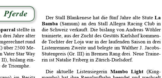 Dass Turf-Times, der beliebte und interessante deutsche Newsletter, nun auch einen kleinen Artikel über den Wechsel von La Bamba in die Schweiz zu uns publiziert hat, erfüllt uns natürlich mit Stolz...