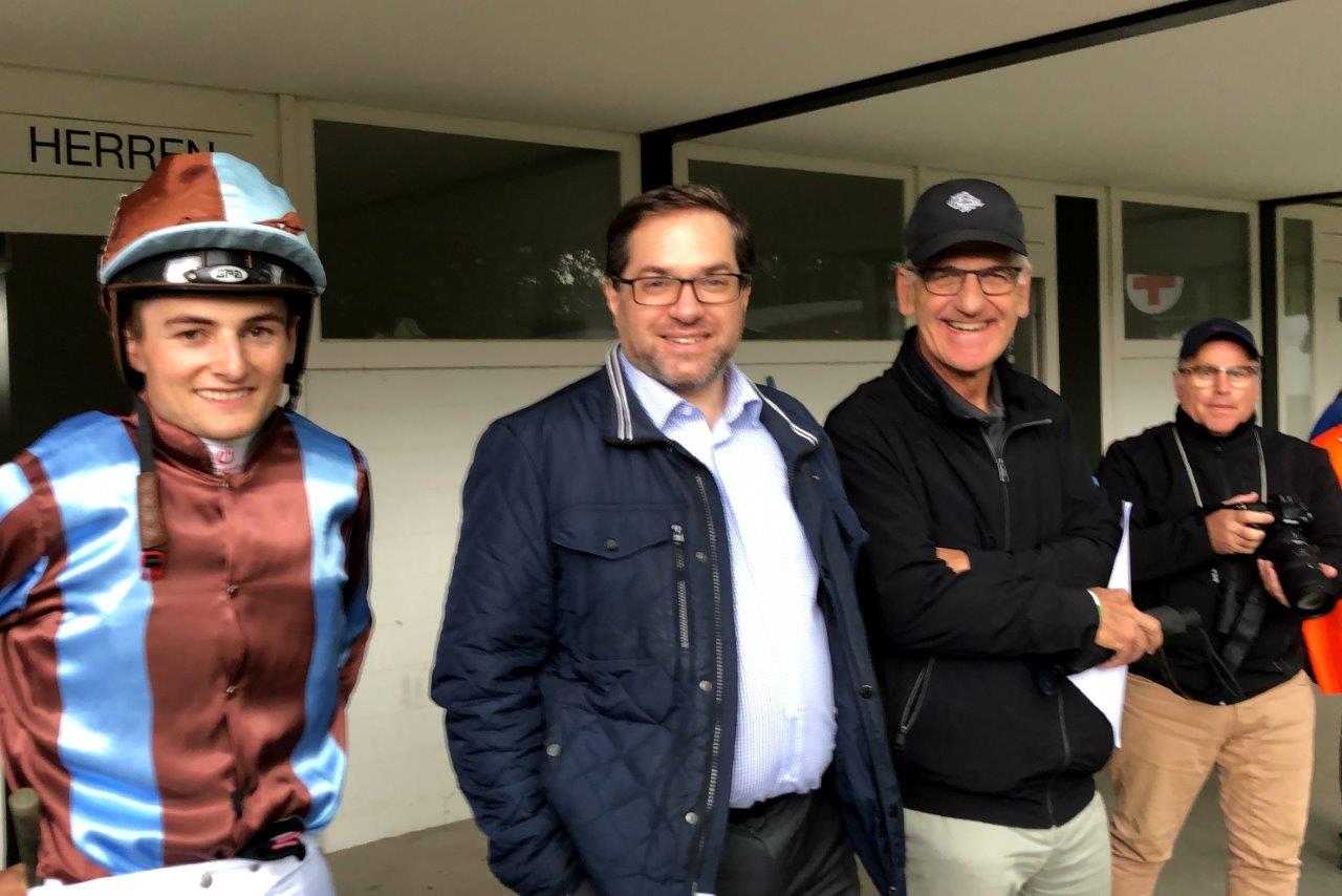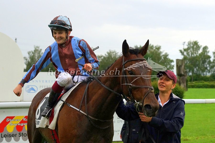 Nun, Dennis hatte beim Aufgalopp alle Hände voll zu tun, Suprimos Vorwärtsdrang zu zügeln. Auch im Rennen wäre Suprimo über weite Strecken gerne schneller gegangen als Dennis dies zuliess. Aus dem Schlussbogen heraus hatte Dennis (und wir auch!) ein sehr gutes Gefühl. Suprimo übernahm leicht die Spitze und schien die Gegner um ihn herum im Griff zu haben. Einer kam dann doch noch nahe, und erst noch recht viel Schwung. "Da dachte ich einen Moment, es könnte knapp werden", so Dennis, "doch dann nahm Suprimo sein Herz nochmal in beide Hände und hielt dagegen." Eine Länge Vorsprung hatte unser erster Schweizer Galopp-Sieger im Ziel.