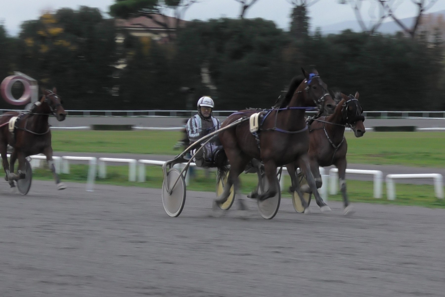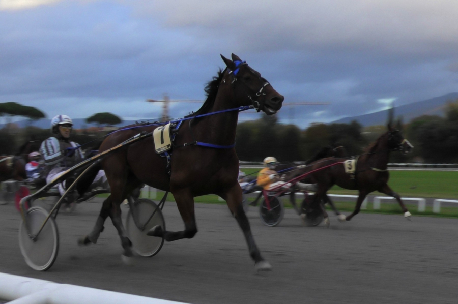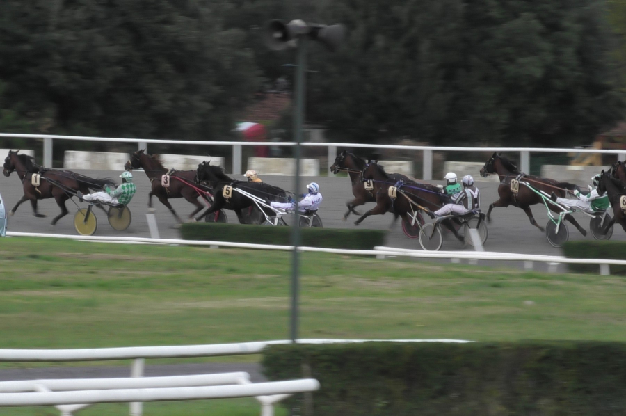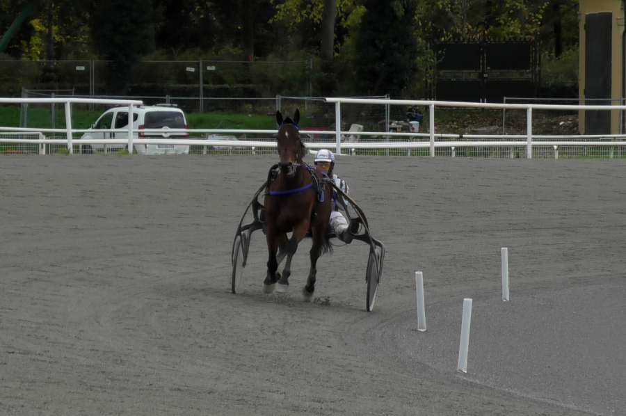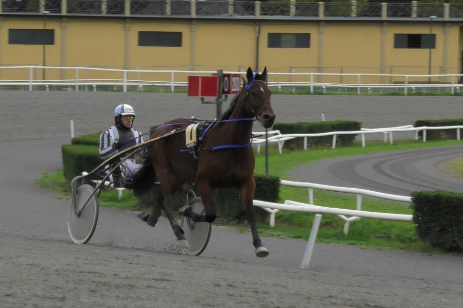 Mit Startposition 7 (ganz aussen in der ersten Reihe) rechneten wir uns nur minimste Chancen auf eine vordere Platzierung aus. Das höchste der Gefühle wäre ein 5. Platz, so unsere Einschätzung vor dem Rennen. Loris liess RUSHMORE gar nicht erst antreten beim Start, um keine unnötige Energie zu verbrauchen. Eine Runde vor Schluss lagen die beiden an 6./7. Stelle und Loris sagte hinterher, er hätte zu Beginn der letzten Gegenseite ein sehr gutes Gefühl gehabt RUSHMORE sei sehr gut gegangen und hätte ihm gezeigt, dass er noch zulegen könnte. Doch vor dem letzten Bogen irrte er sich kurz in der Gangart - nicht Galopp, sondern Pass. Ist oft der Fall, wenn Traber vorne zu wenig Gewicht an den Hufen haben. (Gummi)Glocken wären hilfreich in solchen Fällen, zum Beispiel. Aber weil der Heat top war, hatte Loris keinen Anlass dafür gehabt (zumal RUSHMORE in Mailand auch "ohne" gelaufen war). Später zeigte sich zudem, dass RUSHMORE sich einen (kleinen) Hornspalt geholt hatte - half natürlich auch nicht. Jedenfalls konnte Loris ihn in der Endphase nicht mehr vorwärts fahren, sondern musste quasi tatenlos warten, bis das Ziel erreicht war. Schade, er war sich sicher, dass Rang vier oder zumindest fünf drin gelegen hätte.