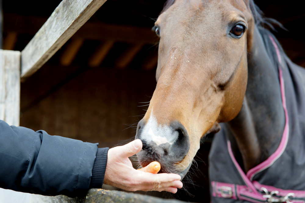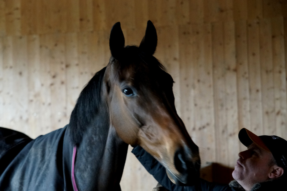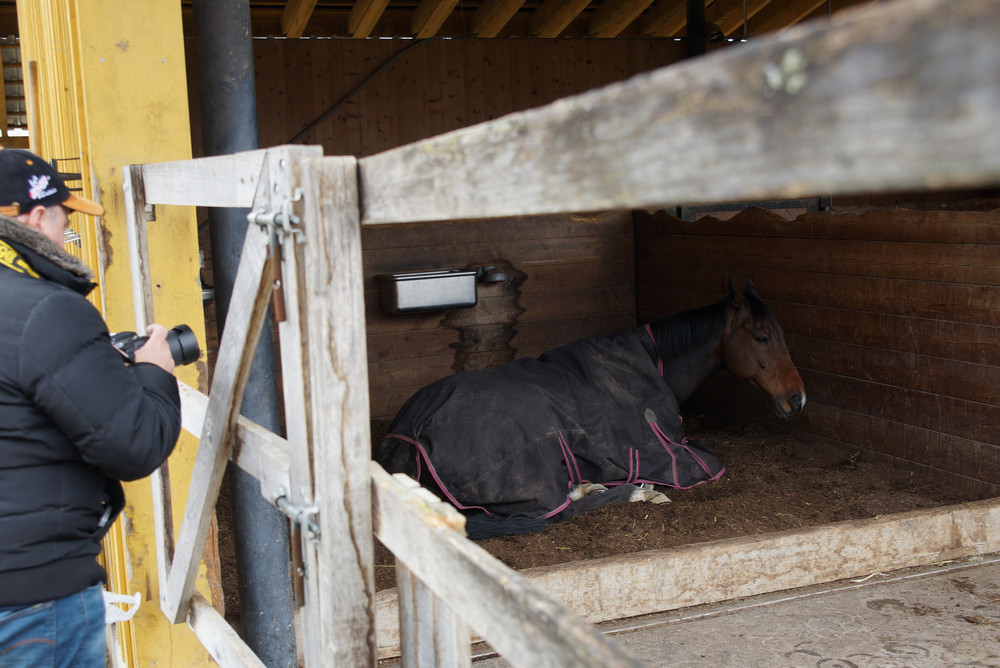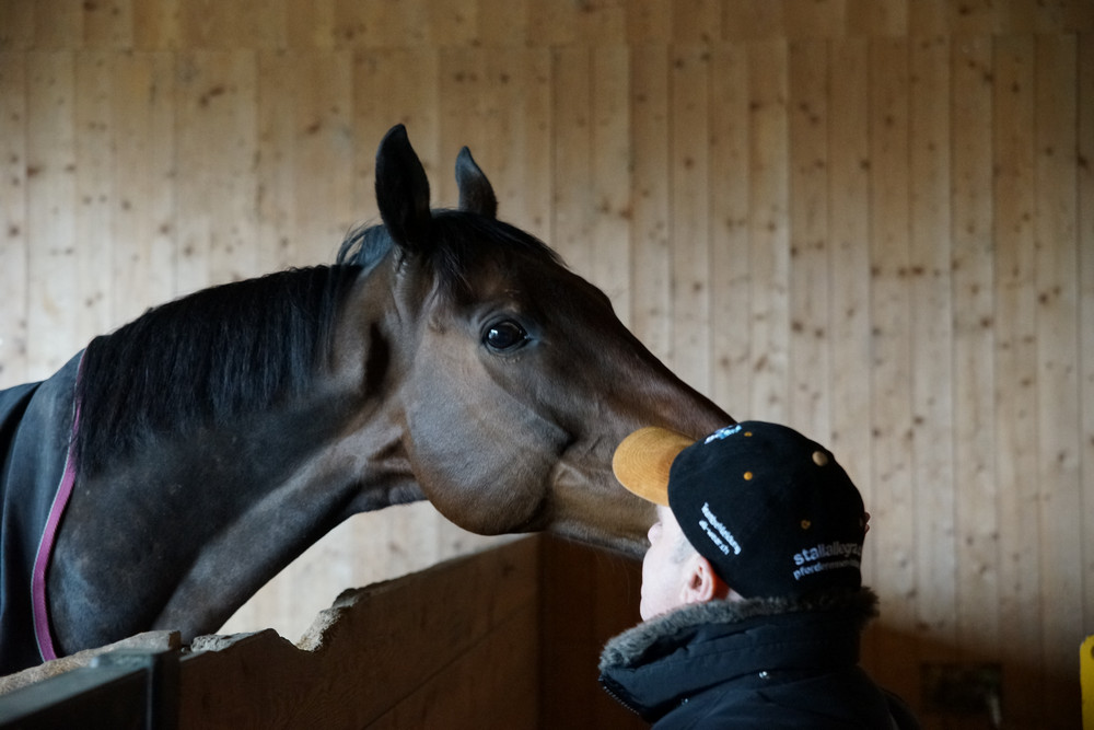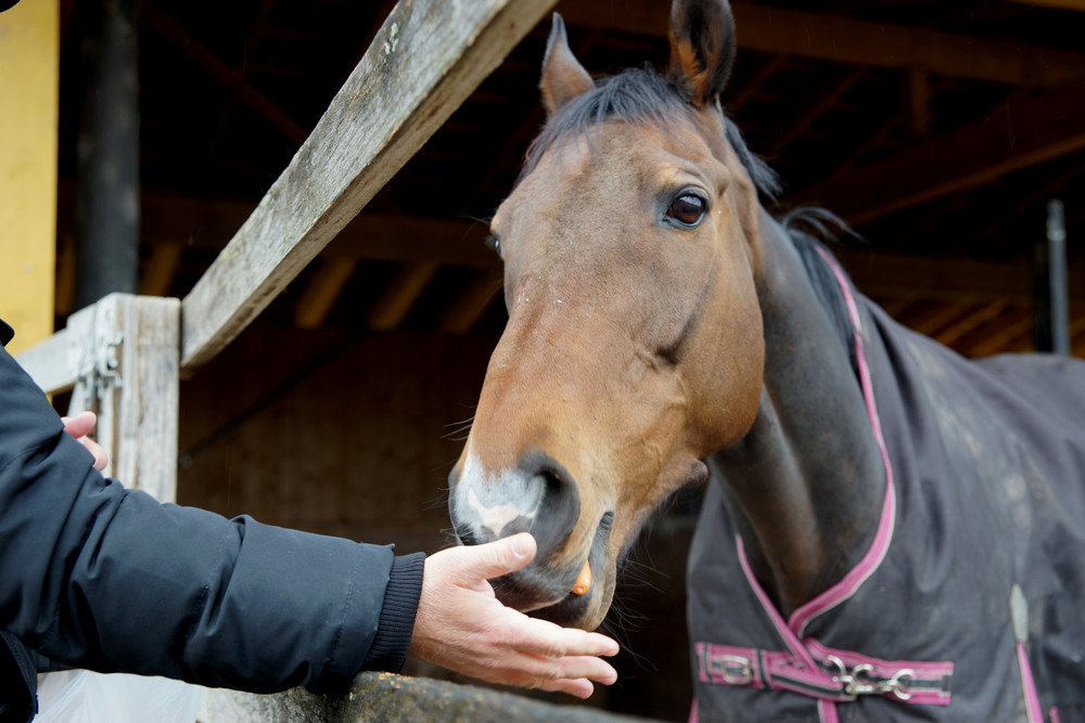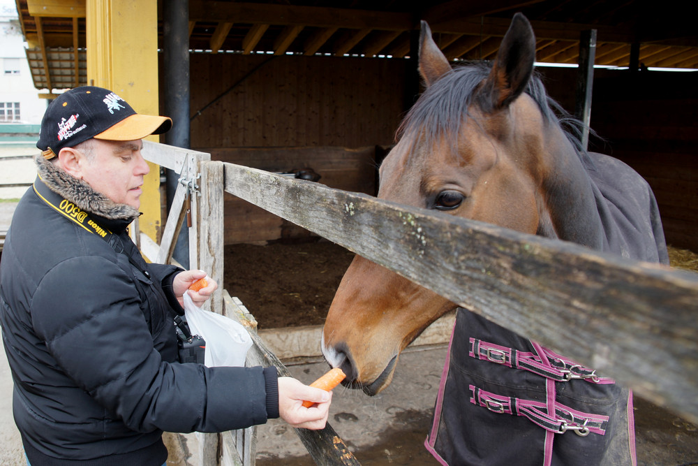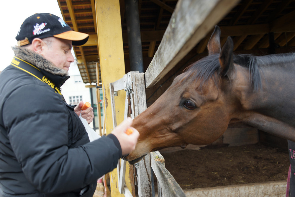 Knapp 10 Minuten dauert die Fahrt von Niederhasli, wo Christian und Markus wohnen, zu Hecto nach Affoltern. Ein Besuch am Samstag vor dem Dubai World Cup-Finale drängte sich deshalb gerade zu auf. Und Hecto war in bester Besuchslaune. Zunächst lag er einfach nur gemütlich in seiner Boxe, nahm nicht wirklich Notiz von den Besuchern. Seine Audienz begann dann, als ihm wohl in den Sinn gekommen war, dass Besucher ab und zu was mitbringen. Die Rüebli mochte er jedenfalls sehr gern!