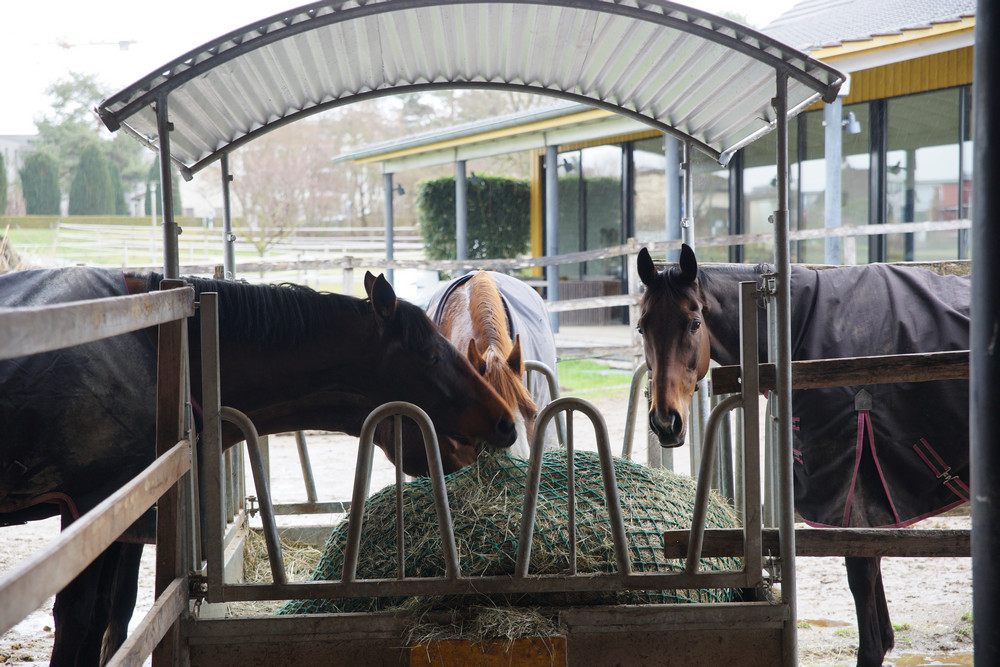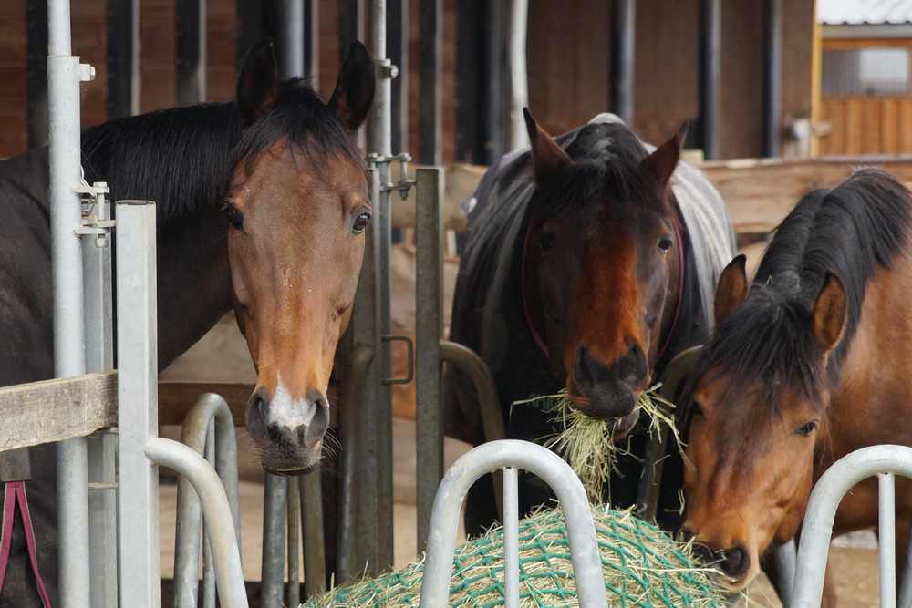 Hecto (rechts) beim gemütlichen Heu-Plausch mit seinen neuen Kollegen.