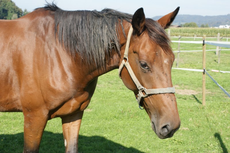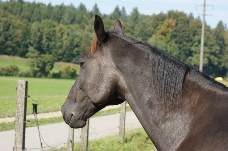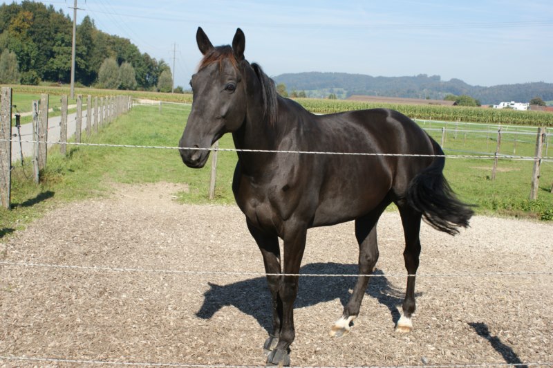 Quito schaut auf seinem Paddock mit direktem Zugang zur Weide zu...