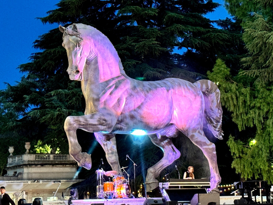 Mit der richtigen Beleuchtung sah das nach Entwürfen von Leonardo da Vinci gebaute Pferd noch eindrücklicher aus: 7.2 Meter hoch, 15 Tonnen schwer!