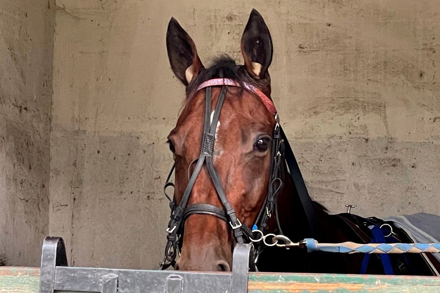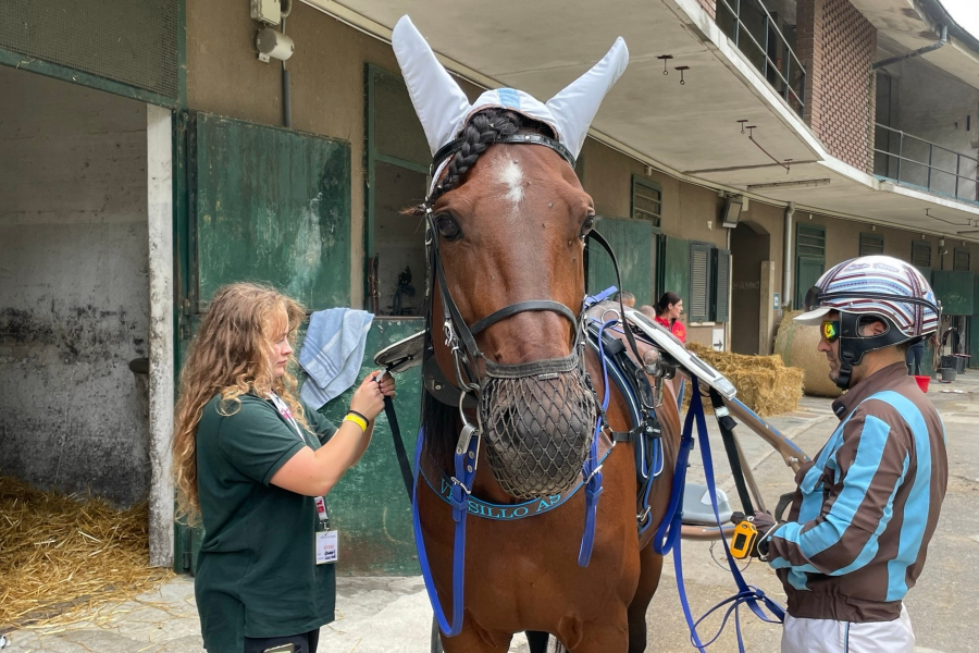 Ankunft auf der Mailänder Trabrennbahn La Maura: Rushmore mit Laurine, beobachtet von Loris.