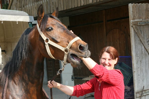 Für uns war Mitsch aber in allererster Linie ein treuer Kamerad. Einer, den man einfach gern haben musste. Als Hengst war er ein ganz lieber. Einer, der seine "Herde" stets freudig begrüsste. Aber ansonsten immer brav war - braver als mancher Wallach... Sowohl im Umgang wie auch vor dem Sulky. So war Mitsch für Stefan Schnider ein hervorragender Lehrmeister. Stefan absolvierte mit ihm die Lizenz-Prüfung, die beiden machten in den Prüfungs-"Rennen" eine sehr gute Figur.
