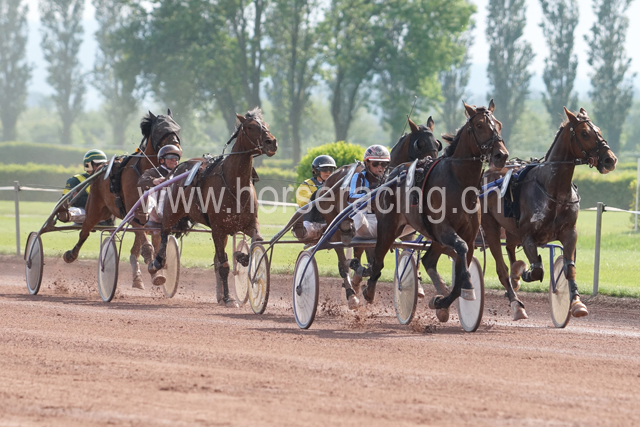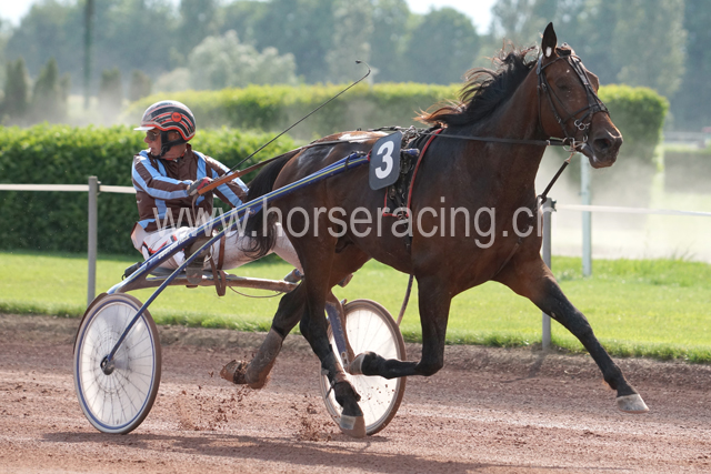 Etwas nervös wurden wir, als es zuerst einen Startabbruch gab und dann noch einen Fehlstart. Ob Playboy das nicht aus dem Konzept bringen würde? Nein, tat es überhaupt nicht. Wim hatte die Situation jederzeit im Griff und legte beim gültigen Startzeichen gar einen Blitzstart hin. Schon im ersten Bogen trabte er hinter den 25 Meter weiter vorne gestarteten Pferden. Und bei der ersten Tribünenenpassage liess er Playboy bereits an die Spitze marschieren. Sich auf keine Spielchen einlassen und selbst das Heft in die Hand nehmen - Wims Taktik war klar. Bis in den letzten Bogen konnte Vatel du Loir folgen, dann musste er abreissen lassen.
