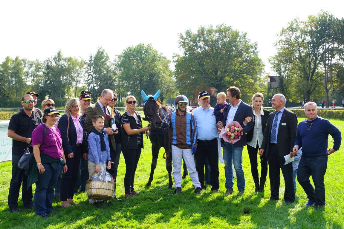 Und darunter noch das shcöne Foto von der grossen Siegerehrung mit Canone am Jockey Club-Renntag in Dielsdorf. Dieses Bild zeigt in seiner ganzen Pracht die Idee, die hinter Stall Allegra steckt: Gemeinsam Freude haben und als Team das scheinbar Unmögliche erreichen!