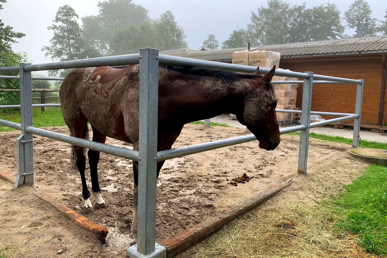 Suprimo auf dem Sandpaddock - den Kopf streckt er da raus, wo der Heuhaufen immer kleiner wird.