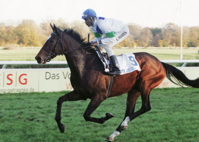 Nun hat es bei den Galoppern weit weniger lang gedauert als wir uns dies hätten träumen lassen (bei den Trabern sind wir dran...!). La Bamba heisst unsere neue Hoffnungsträgerin, die wir durch einen glücklichen Zufall erwerben konnten: Bereits im Frühling hatten wir uns für die Samum-Tochter interessiert, doch damals war sie (für unser Budget) nicht zu haben. Inzwischen hat sie sich enorm entwickelt, lief diese Saison dreimal als Listed-Zweite ins Ziel und holte im Herbst je einen 3. und 4. Platz auf Gruppe-III-Ebene!
