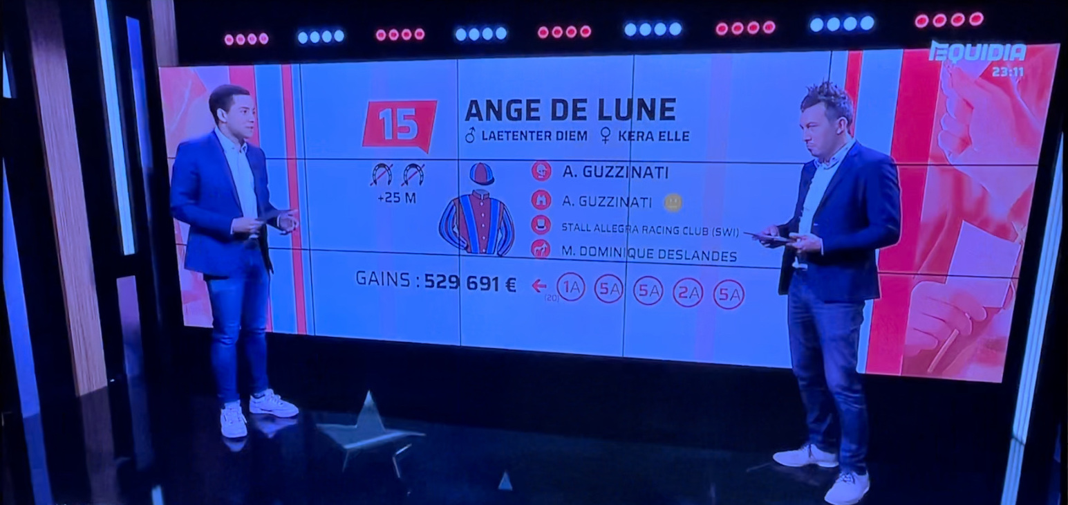 Auf Equidia wurde in der Quinté-Vorschau über Ange beraten, doch er kann leider nicht laufen (man beachte, dass hinter Stall Allegra Racing Club extra ein "SWI" für Switzerland eingeblendet ist).