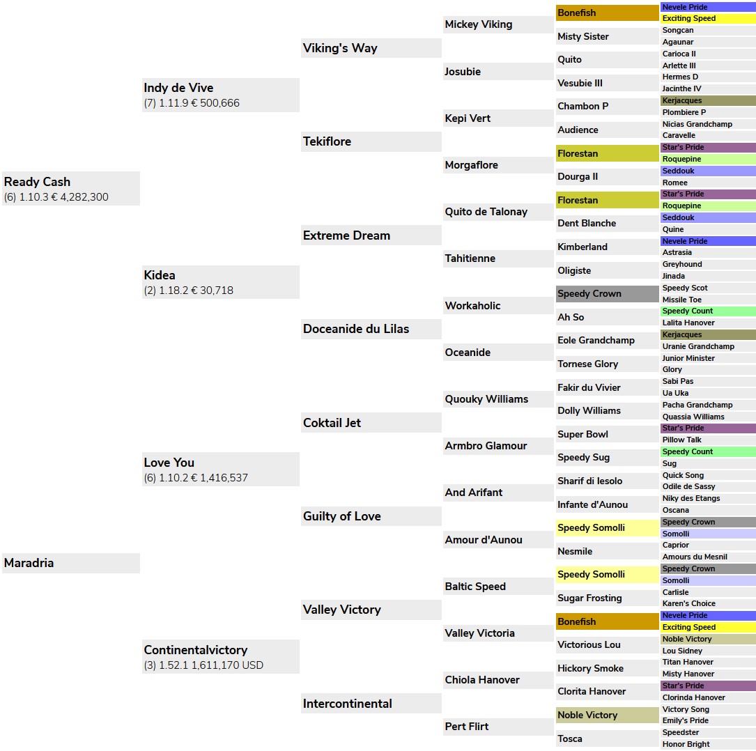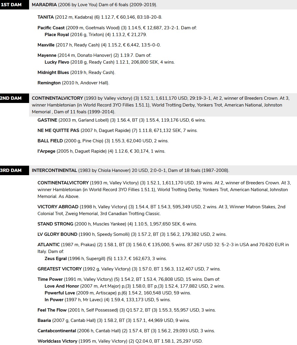 - MIDNIGHT BLUES ist am 24. April 2019 in der Normandie geboren. Sein Züchter Jean-Pierre Dubois ist Zucht-Guru; aber auch er züchtet nicht alle Tage Pferde mit so einem fantastischen Pedigree. Der Vater READY CASH ist seit Jahren der führende Deckhengst in Frankreich, einer der besten weltweit. Ein Schäferstündchen mit ihm kostet aktuell über 40'000 Euro (zahlbar bei Reservation; Erfolg in Form eines Fohlens also ungewiss…). Und die Mutter MARADRIA stammt von LOVE YOU, einem anderen Top-Vererber, der die Zucht in den letzten Jahren geprägt hat. Zwei absolute Super-Traber, die zusammen 4 Prix d’Amérique-Siege erzielt haben, haben genau diese Kreuzung: Ready Cash als Vater und Love You als Grossvater. Die Namen der beiden? BOLD EAGLE und FACE TIME BOURBON. Und es geht in der Mutterlinie von MIDNIGHT BLUES noch formidabler weiter. Seine Grossmutter mütterlicherseits war nämlich eine absolute Championne: CONTINENTALVICTORY gewann 18 ihrer 27 Rennen (darunter das Hambletonian gegen die Hengste und das Yonkers Trot), verdiente über 1.6 Millionen US-Dollar.