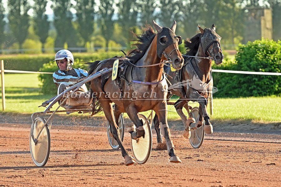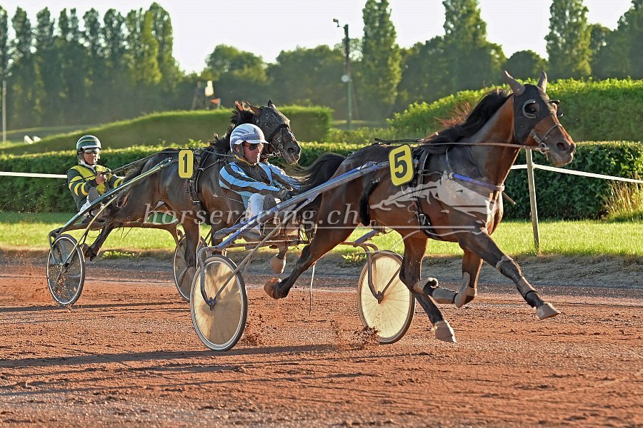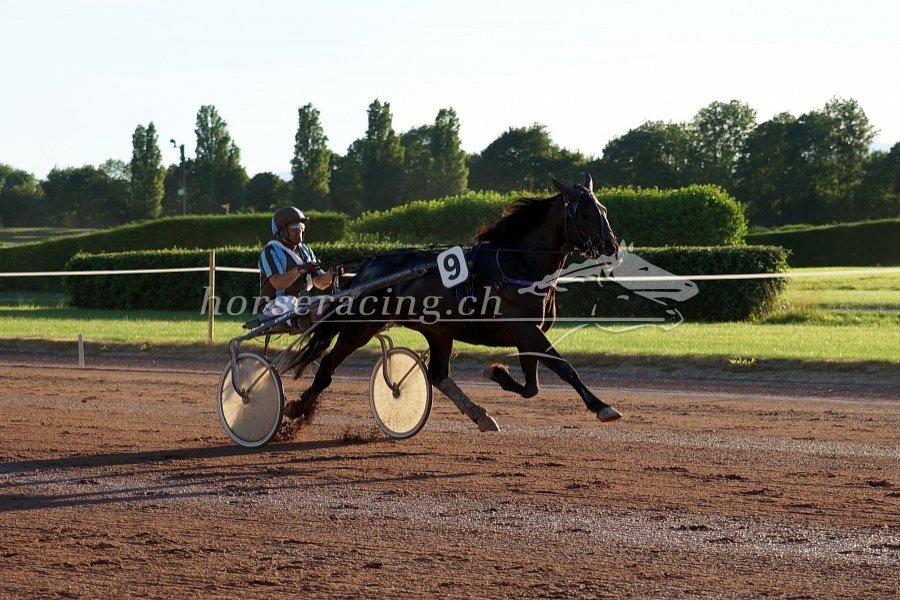 Wir hatten eigentlich ULYSSE (mit Loris) etwas mehr als REBUS zugetraut. Doch für ihn war das Rennen leider etwas zu langsam gelaufen. Eine gute Runde lang wurde gebummelt (19er/20er-Zeiten auch gerade aus waren keine Seltenheit), Ende der letzten Gegenseite ging man nicht schneller als 1:15/1:16 (rund 47 km/h), durch den Schlussbogen um 20 herum. Loris hatte mit ULYSSE noch viel im Tank - doch die meisten anderen (wie in solchen Rennen üblich) halt eben auch. So war die schöne Beschleunigung von ULYSSE nicht sonderlich wirkungsvoll: 1:11, dann 08, sogar 07 und lange Zeit weiter in 08, 09 und schliesslich 10. Das reichte für Rang fünf. Gute fünf Längen vom zweiten Platz. Eine gute Vorstellung, kein Zweifel. Zumal Ulysse wie eine 1 trabte, das war das allerwichtigste. Er braucht etwas schneller gelaufene Rennen, um seine Stärken voll zur Geltung bringen zu können. Und solche werden bald wieder kommen. Wir freuen uns jedenfalls schon auf den Grand Prix d'Eté in zwei Wochen mit ihm.