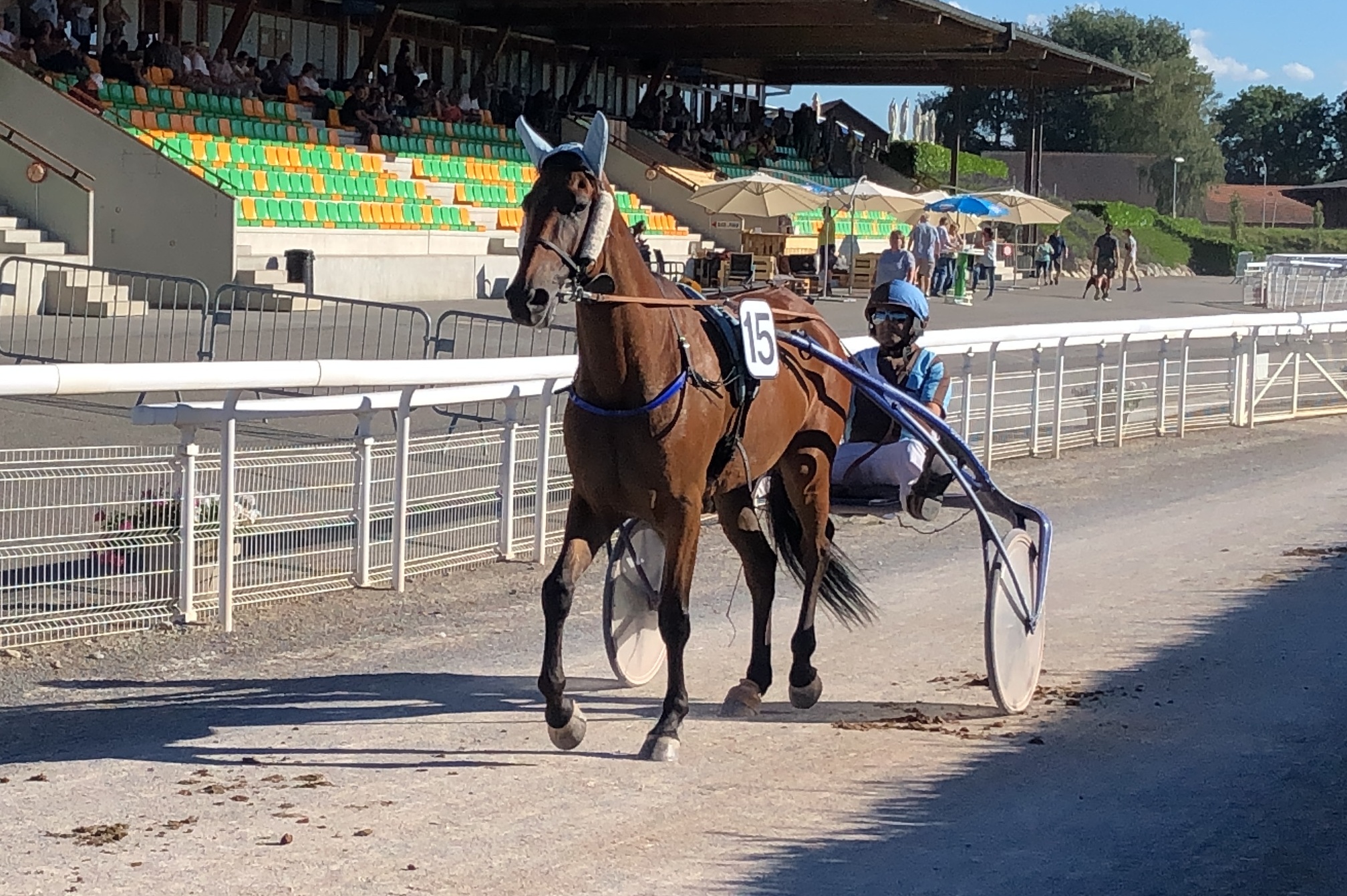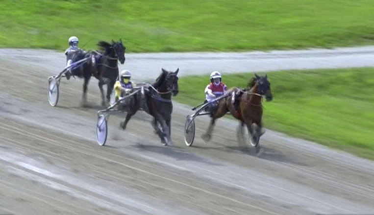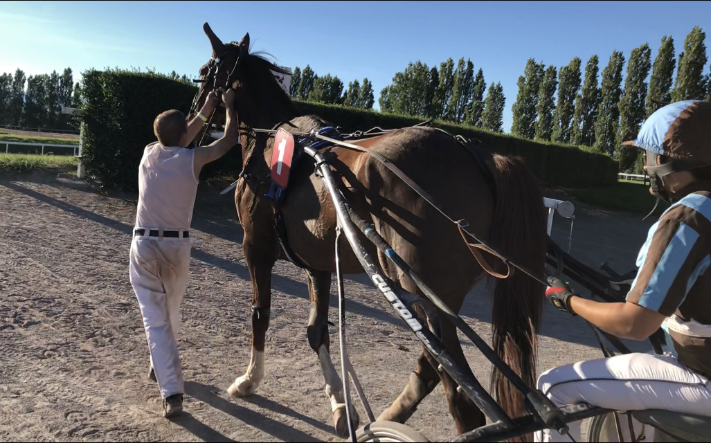 Zuvor hatte auch FIDDLE eine sehr gute Leistung gezeigt. Bei seinem dritten Rennen nach langer Pause lief er wie schon bei den beiden zuvor auf Rang drei. Auch wenn es an den Resultaten nicht abzulesen ist, steigerte er sich jedes Mal (zeigen die Kilometer-Zeiten: 1:18,0 beim Schweizer Debüt, 1:17,0 am 22. Juni und diesmal nun 1:16,4 - immer auf derselben Distanz von 2350m). Loris liess FIDDLE aus der zweiten Reihe gestartet stets in der Nähe der Favoritin traben. Aus deren Rücken heraus beschleunigte Fiddle in der Zielgeraden nach einem lange langsamen Rennen von 1:15 über 1:13 auf 1:10, dann auf 09 und 08. Lange hielt er ein 10er-Tempo (rund 51.5 km/h), dann nochmal 09 und schliesslich bis am Ende 1:11 bis 1:13. Nur von zwei sehr guten Pferden geschlagen reichte dies zu Rang drei im 15er-Feld. Dies notabene ohne von Loris gefordert worden zu sein, ganz wie er es selbst wollte. Top, so macht es Freude.