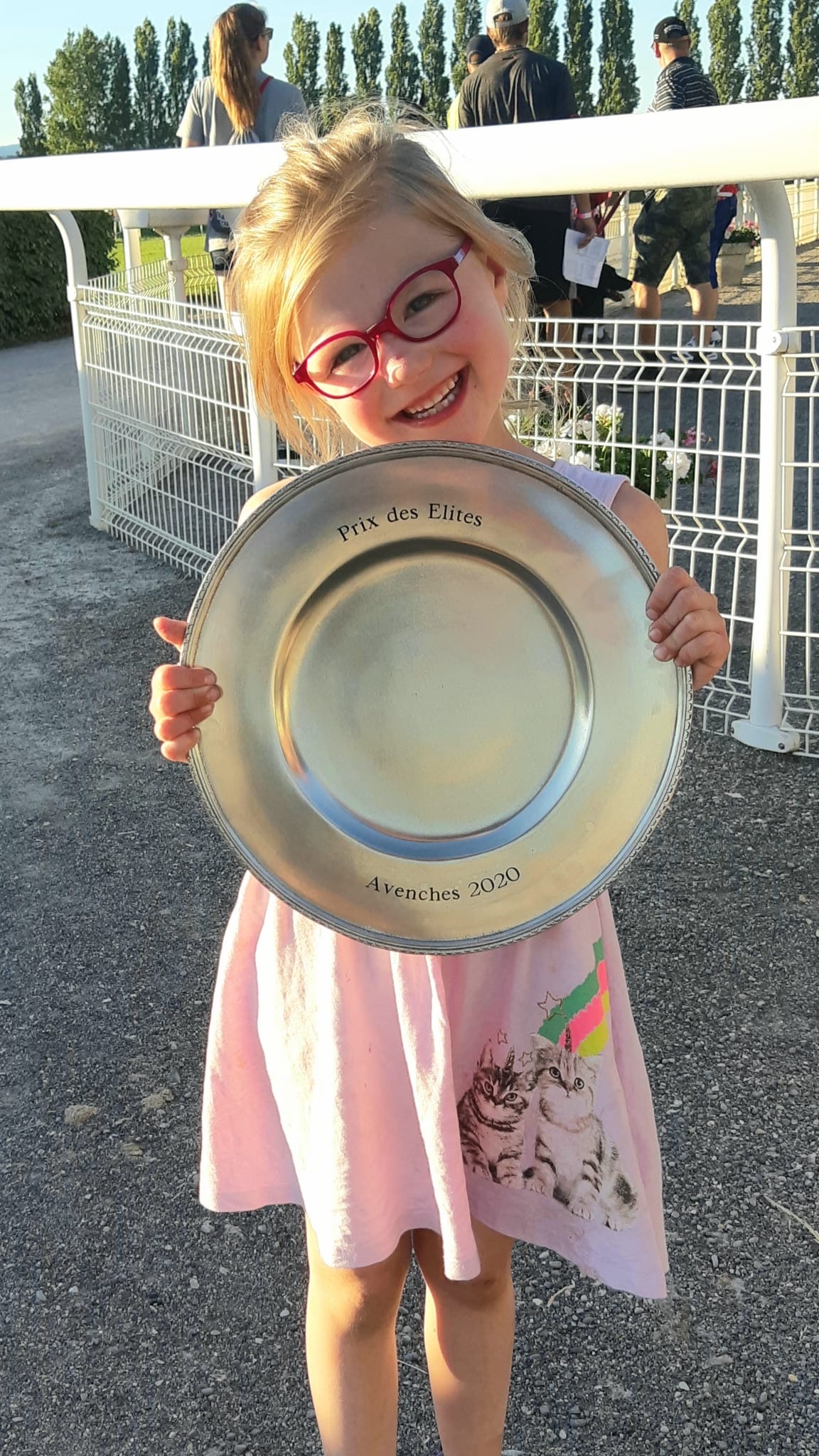 Anja präsentiert stolz den Zinnteller - der "Kübel" wird noch ausgetauscht (das war derjenige für den Prix d'Eté, der am 19. Juli stattfindet...)