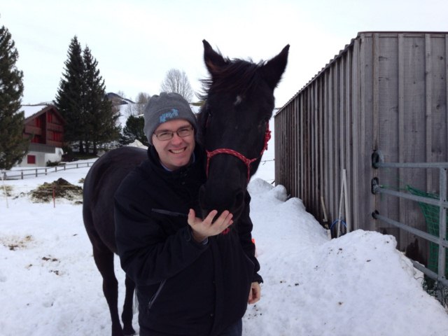 Am 14.Dezember waren wir zu Besuch, Pia und Beatrice haben uns pünktlich beim vereinbarten Treffpunkt abgeholt. Und trotz starkem Wind (Föhn, den kennt Markus noch aus der Bündner Herrschaft, aber nicht ganz so heftig) schien Jyri seinen ehemaligen Mitbesitzer noch zu kennen. Jedenfalls war er sehr zutraulich (was aber auch an den Bio-Rüebli in der grossen Jacken-Tasche liegen könnte).